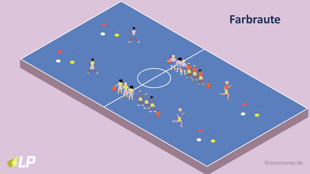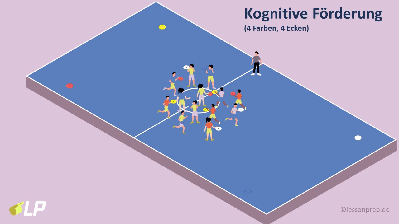 - Regelergänzung: Nach dem Pfiff wird eine gerade oder ungerade Zahl gerufen. Bei gerader Zahl laufen die SuS zu der Farbe, die sie in der Hand haben (wie zuvor). Bei einer ungeraden Zahl laufen sie zur Farbe diagonal gegenüber.