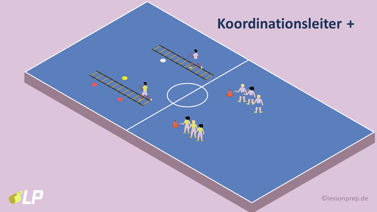- Als Aktivierung bei Ballsportarten kann zusätzlich (z.B. mit inaktiven SuS oder der Wand) Pass-Rückpass am Ende der Koordinationsleiter gemacht werden.