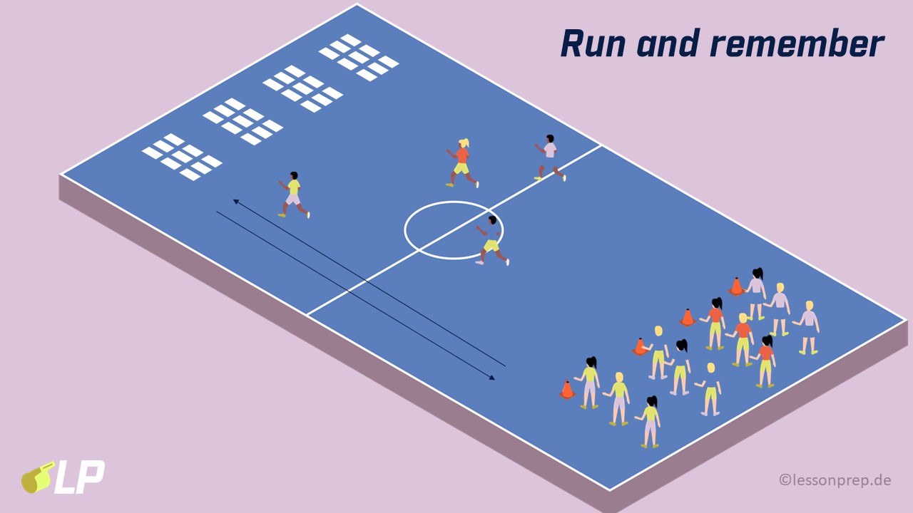 - Die erste Person sprintet zurück und klatscht Person 2 ab, die dann los läuft und dasselbe tut. Danach Person 3 usw.