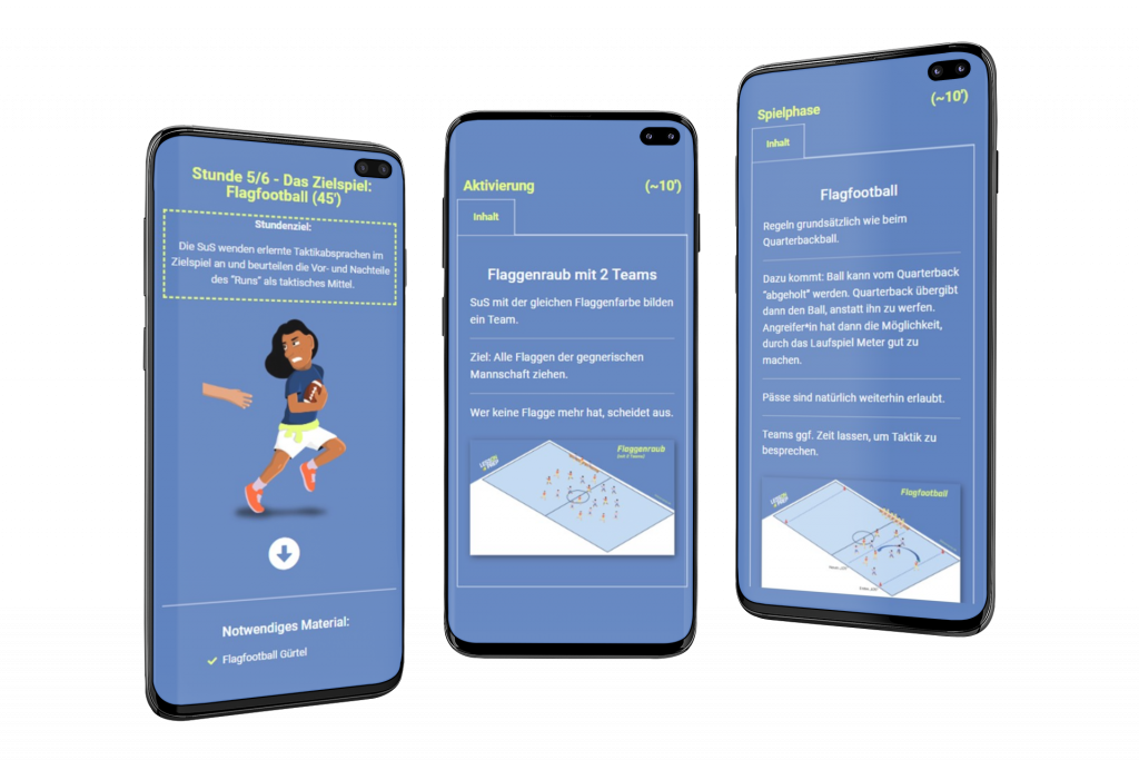 Beginnend mit der Gewöhnung an das Ziehen der Flagge erlernen die Schülerinnen und Schüler schrittweise die Spielidee des Endzonenspiels Flagfootball.