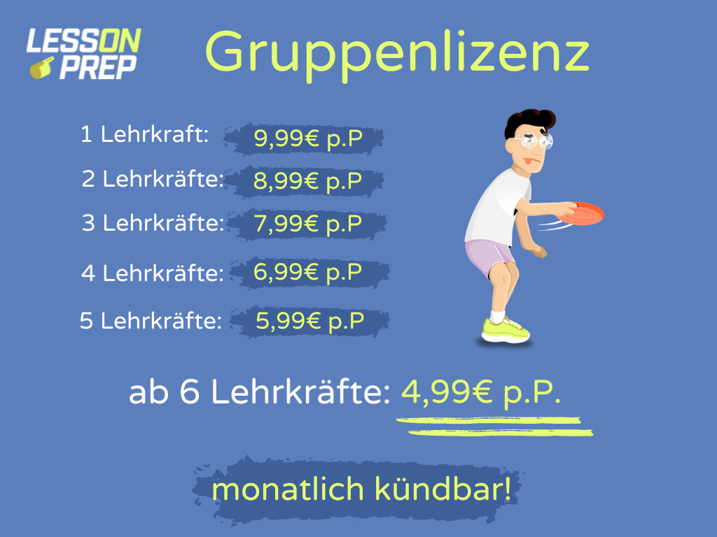 *Diese Regelung gilt nur bis zur sechsten Lehrkraft. Noch größere Gruppen sind zwar möglich, jedoch bleibt der Preis bei 4,99€ pro Person.