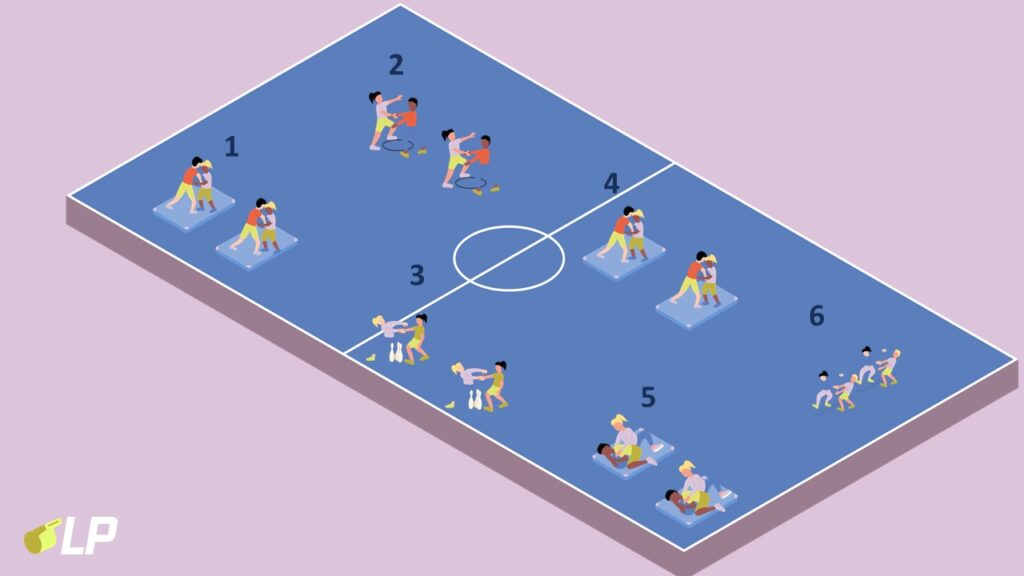 • Op commando verzamelen ze zich in een kleine groep en voeren de bewegingsopdracht uit die op de afbeeldingen wordt weergegeven.