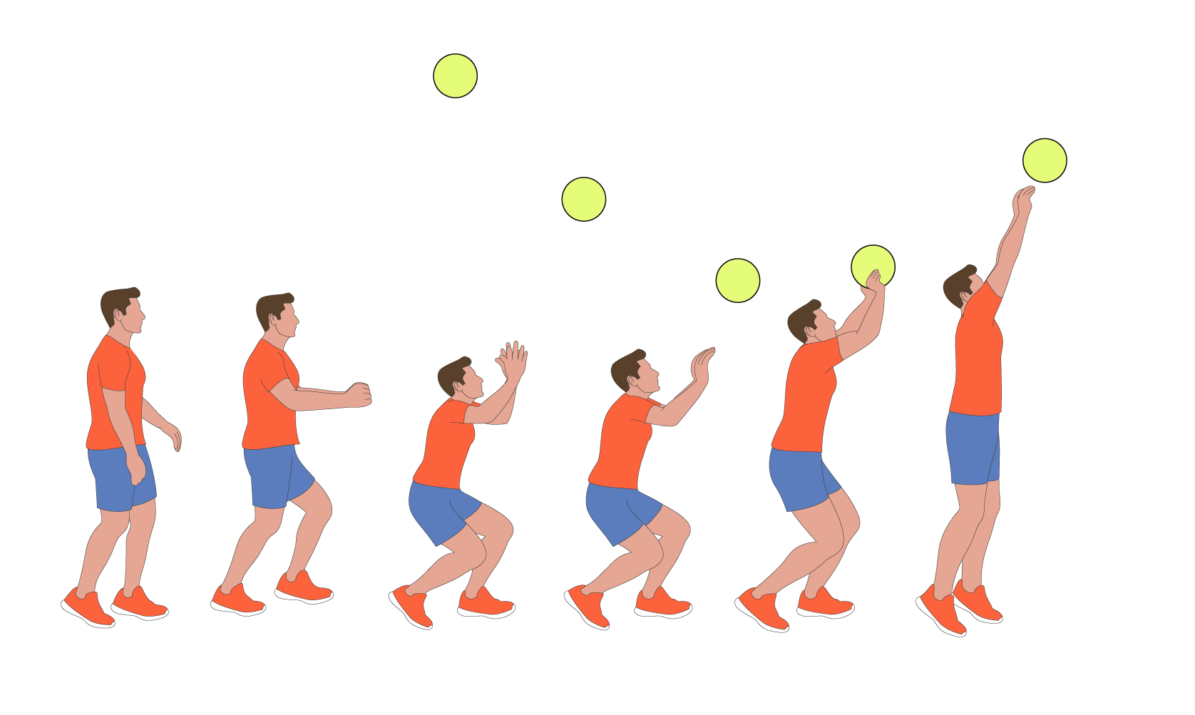 - Gooi de bal 3 keer omhoog en vang hem met beide handen op in de “handdriehoek” op voorhoofdhoogte.